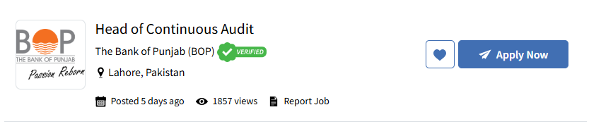 The Bank of Punjab is currently hiring for the position of Head – Continuous Audit within its Risk Management Group. This is a senior-level role offering a strong career path in one of Pakistan’s leading financial institutions. Selected candidates may be posted anywhere in Pakistan, depending on the bank’s requirements, as well as the applicant’s qualifications and professional experience.